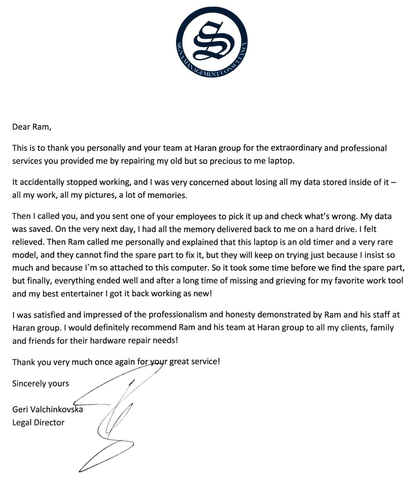 This is to thank you personally and your team at Haran group for the extraordinary and professional services you provided me by repairing my old but so precious to me laptop.