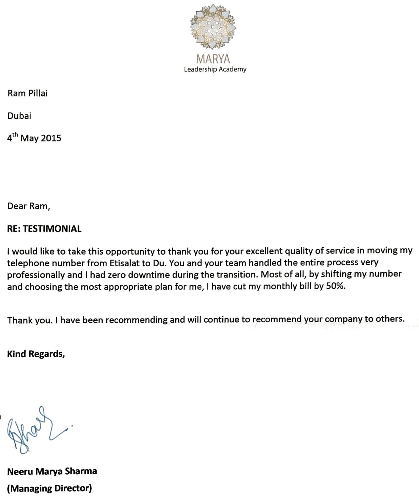 I would like to take this opportunity to thank you for your excellent quality of service in moving my telephone number from Etisalat to Du.