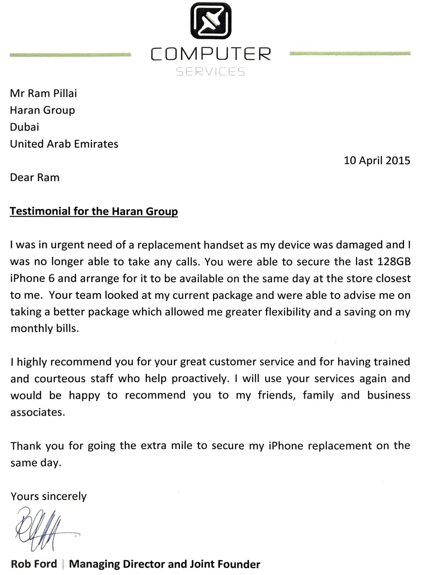I highly recommend you for your great customer service and for having trained and courteous staff who help proactively. I will use your services again and would be happy to recommend you to my friends, family and business associates.